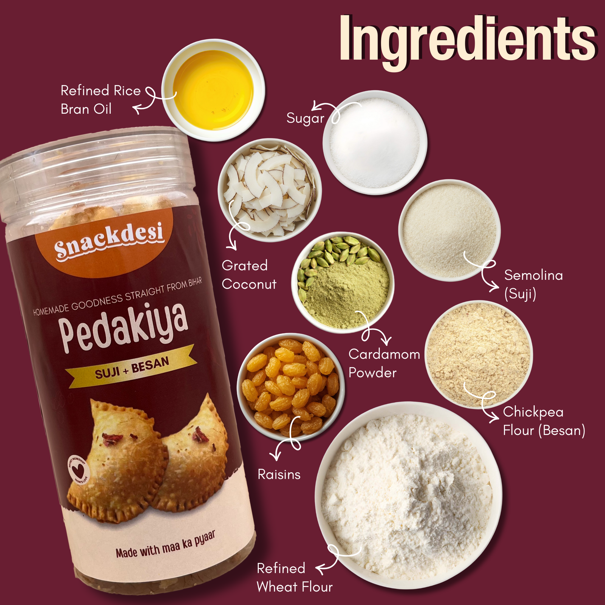 Ingredients: Refined Wheat Flour, Semolina (Suji), Chickpea Flour(Besan), Sugar, Refined Rice Bran Oil, Grated Coconut, Raisins, Cardamom Powder